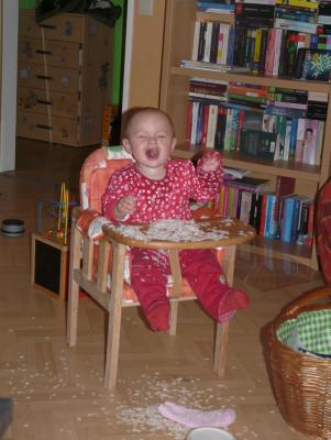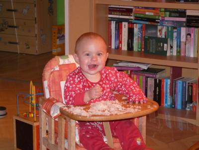 Noch bleiben bei mir zwar die Zähne aus, aber essen tue trotzdem fast alles. Besonders viel Spaß macht es natürlich wenn ich alleine mümmeln darf ..